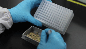 在湖南長(zhǎng)沙的岳麓山種業(yè)創(chuàng)新中心,分子育種實(shí)驗(yàn)室研究員李樂(lè)正在把脫殼的水稻種子放進(jìn)樣品盤里,隨后將樣品放置在全自動(dòng)移液工作站上,進(jìn)行樣品DNA的提取。該樣品是一份田間試驗(yàn)的低鎘水稻種子,這是岳麓山種業(yè)創(chuàng)新中心受種業(yè)企業(yè)委托選育的品種。