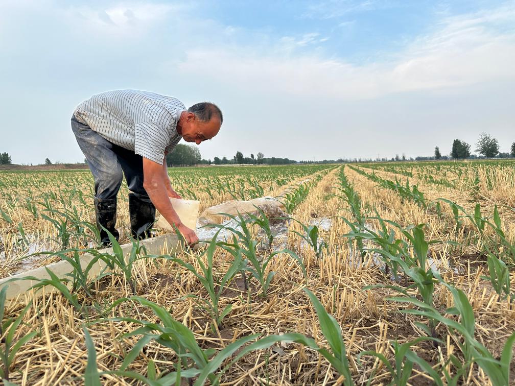 6月18日,在山東省菏澤市巨野縣麒麟鎮(zhèn)一處農(nóng)田,農(nóng)民江福華在灌溉玉米。新華社記者 王陽(yáng) 攝