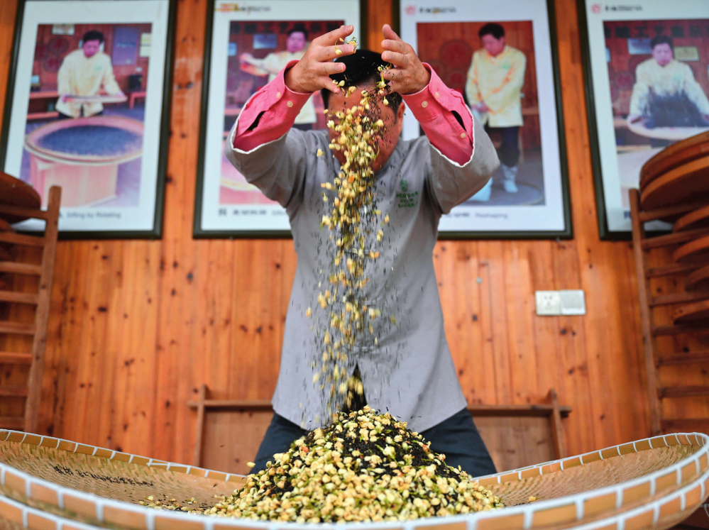 在福州茉莉花茶制茶工坊,福州茉莉花茶傳統(tǒng)窨制工藝大師傅天甫進(jìn)行制茶的第六道工序“窨”(2022 年12 月 16 日攝)周義攝 / 本刊