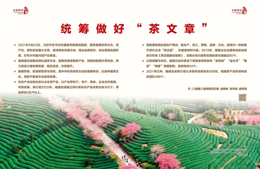 2021年3月22日,習(xí)近平總書記在福建考察期間強(qiáng)調(diào),要統(tǒng)籌做好茶文化、茶產(chǎn)業(yè)、茶科技這篇大文章,堅持綠色發(fā)展方向,強(qiáng)化品牌意識,優(yōu)化營銷流通環(huán)境,打牢鄉(xiāng)村振興的產(chǎn)業(yè)基礎(chǔ)。