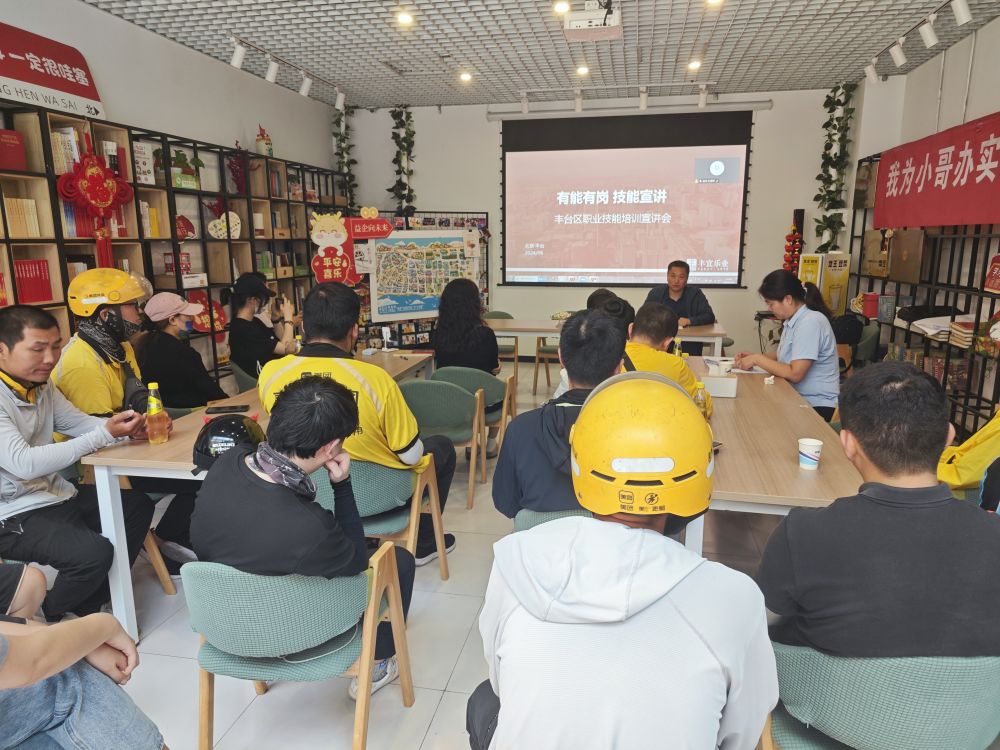 面向外賣員的職業(yè)技能培訓(xùn)會(huì)在北京中關(guān)村豐臺(tái)園內(nèi)的務(wù)工人員之家開講。新華社記者陳旭 攝