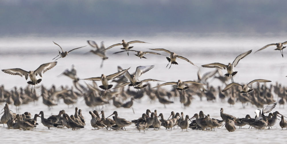 在江西省南昌市,一群黑尾塍鷸在鄱陽湖畔的五星白鶴保護小區(qū)上空飛翔(2023年3月10日攝)。新華社記者 周密 攝