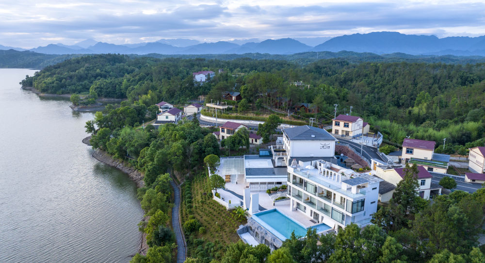 這是江西省武寧縣修河畔“一渡一山海”民宿群,一些返鄉(xiāng)農(nóng)民在這里受聘為民宿管家(2024年6月3日攝,無人機照片)。新華社發(fā)(梁振堂 攝)
