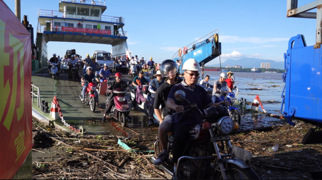7月4日,渡輪抵達江新洲后,人們騎車上岸。新華社記者 周密 攝