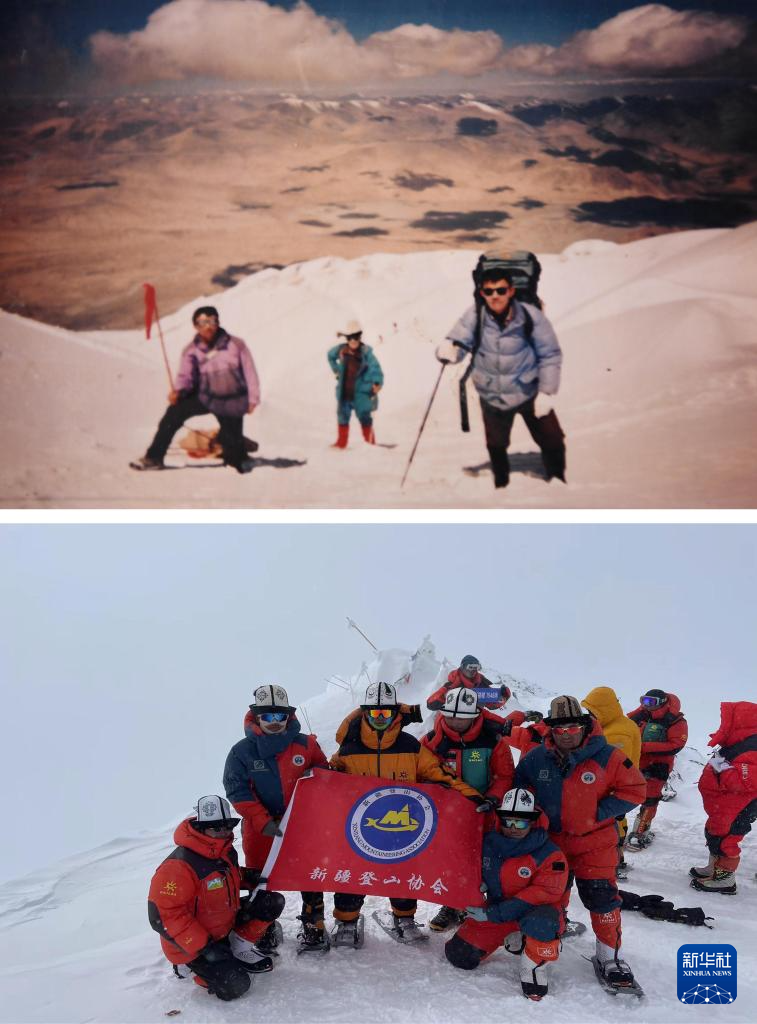 拼版照片:上圖為父親加尼拜克(左)與其兄弟于2004年8月6日一起為國外登山隊服務時在慕士塔格峰上的合影(2024年7月5日翻拍資料照片,新華社記者胡虎虎攝);下圖為兒子塔西巴伊(左三、黃衣者)和同伴于2023年7月29日登頂慕士塔格峰時的合影(受訪者供圖)。新華社發(fā)