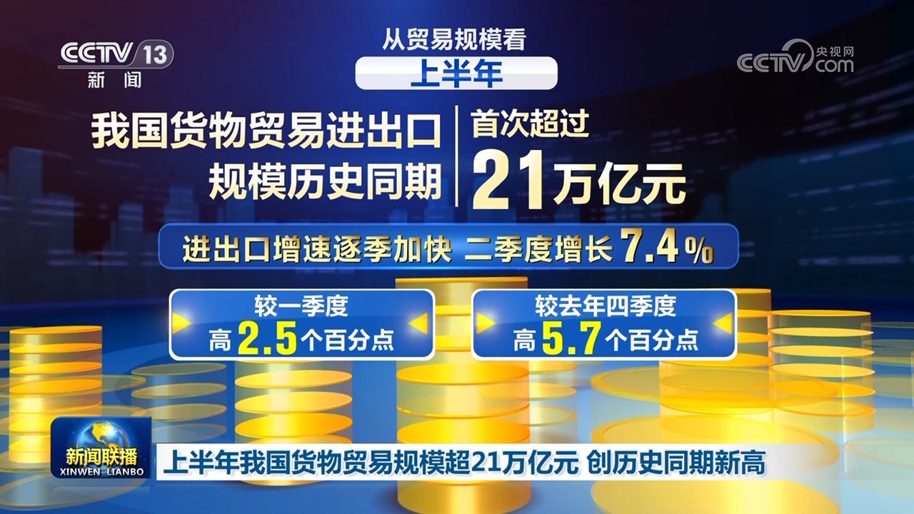 從貿(mào)易規(guī)??矗习肽?,我國貨物貿(mào)易進出口規(guī)模歷史同期首次超過21萬億元。進出口增速逐季加快,二季度增長7.4%,較一季度和去年四季度分別高2.5個、5.7個百分點,貨物貿(mào)易進出口質(zhì)量持續(xù)提升、規(guī)模較快增長。