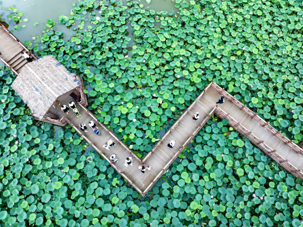 7月14日,游人在江蘇興化里下河國家濕地公園游玩(無人機照片)。新華社發(fā)(周社根攝)