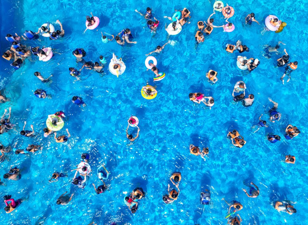 7月14日,人們在重慶市酉陽土家族苗族自治縣一水上樂園游玩戲水(無人機照片)。新華社發(fā)(邱洪斌攝)