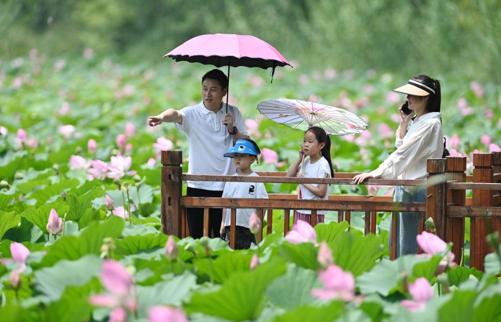 7月14日,游客在山東滕州微山湖紅荷濕地景區(qū)賞花游玩。新華社發(fā)(李志軍攝)