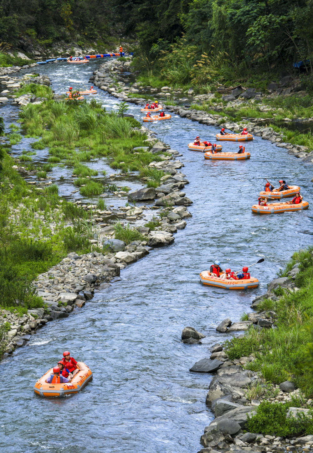7月13日,游客在貴州省黔東南苗族侗族自治州施秉縣杉木河景區(qū)漂流(無人機照片)。新華社發(fā)(磨桂賓攝)