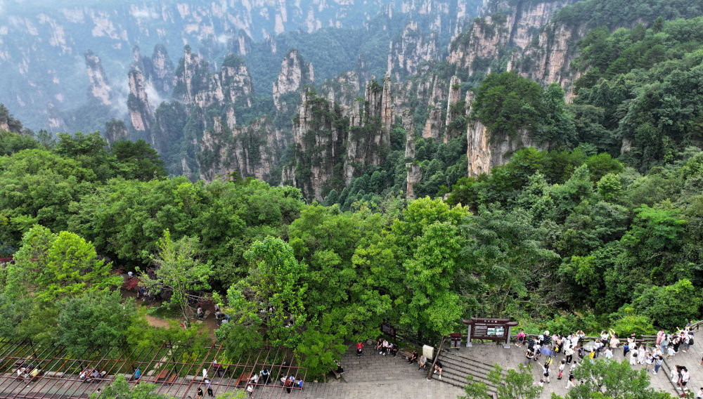 7月14日,游客在張家界國家森林公園天子山游覽(無人機照片)。新華社發(fā)(吳勇兵攝)