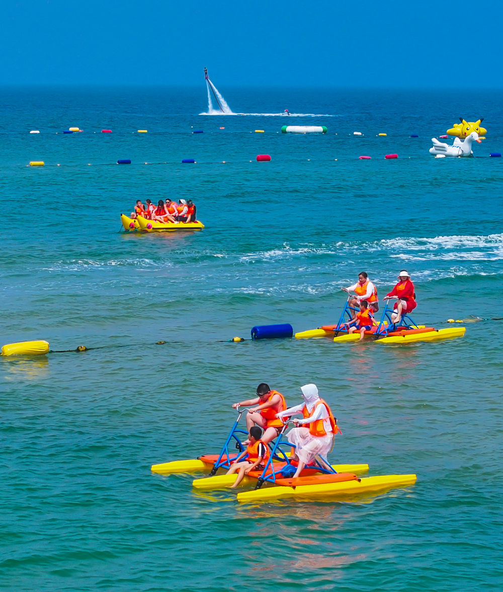 7月13日,游客在山東省榮成市那香海海水浴場體驗水上娛樂項目(無人機照片)。新華社發(fā)(李信君攝)
