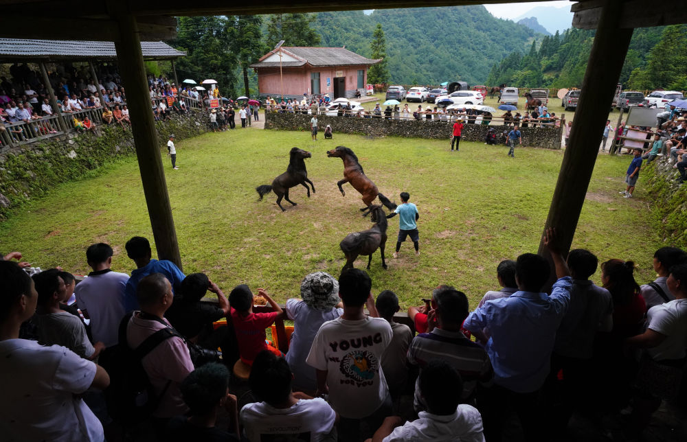 7月13日,人們在廣西融水苗族自治縣安太鄉(xiāng)小桑苗寨觀看斗馬比賽。新華社發(fā)(龍林智攝)