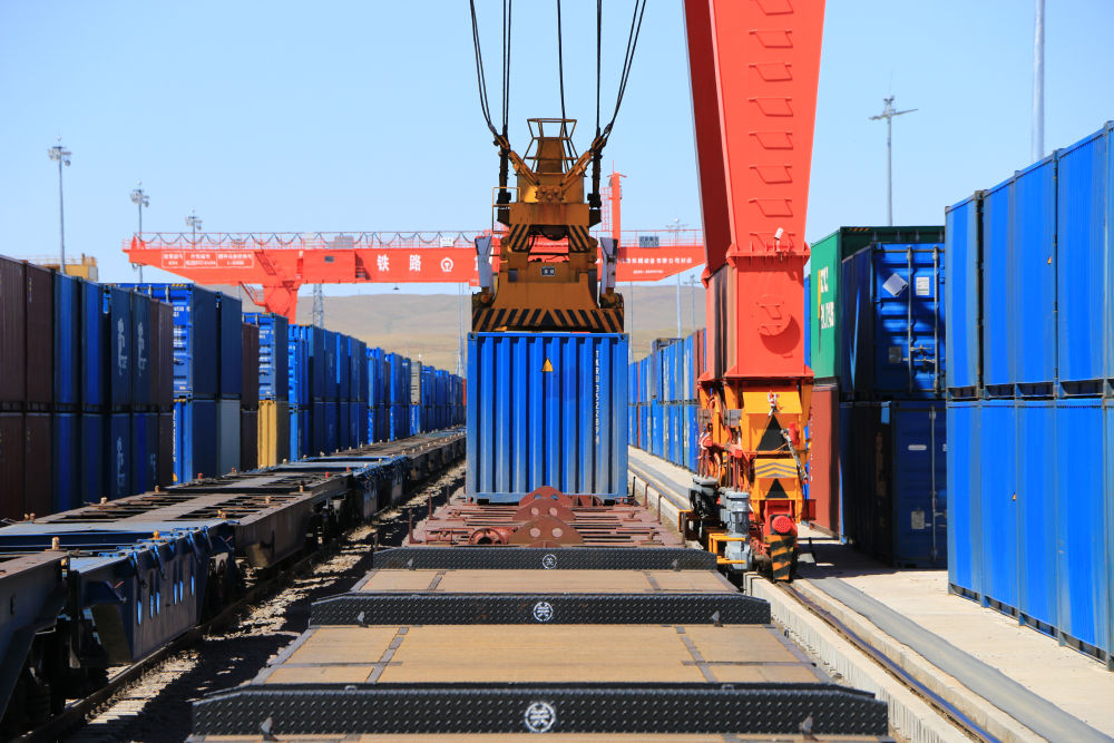 5月15日,中國鐵路哈爾濱局集團(tuán)有限公司滿洲里站貨運(yùn)車間集裝箱場在對中歐班列進(jìn)行換裝作業(yè)。新華社發(fā)(黃旭攝)