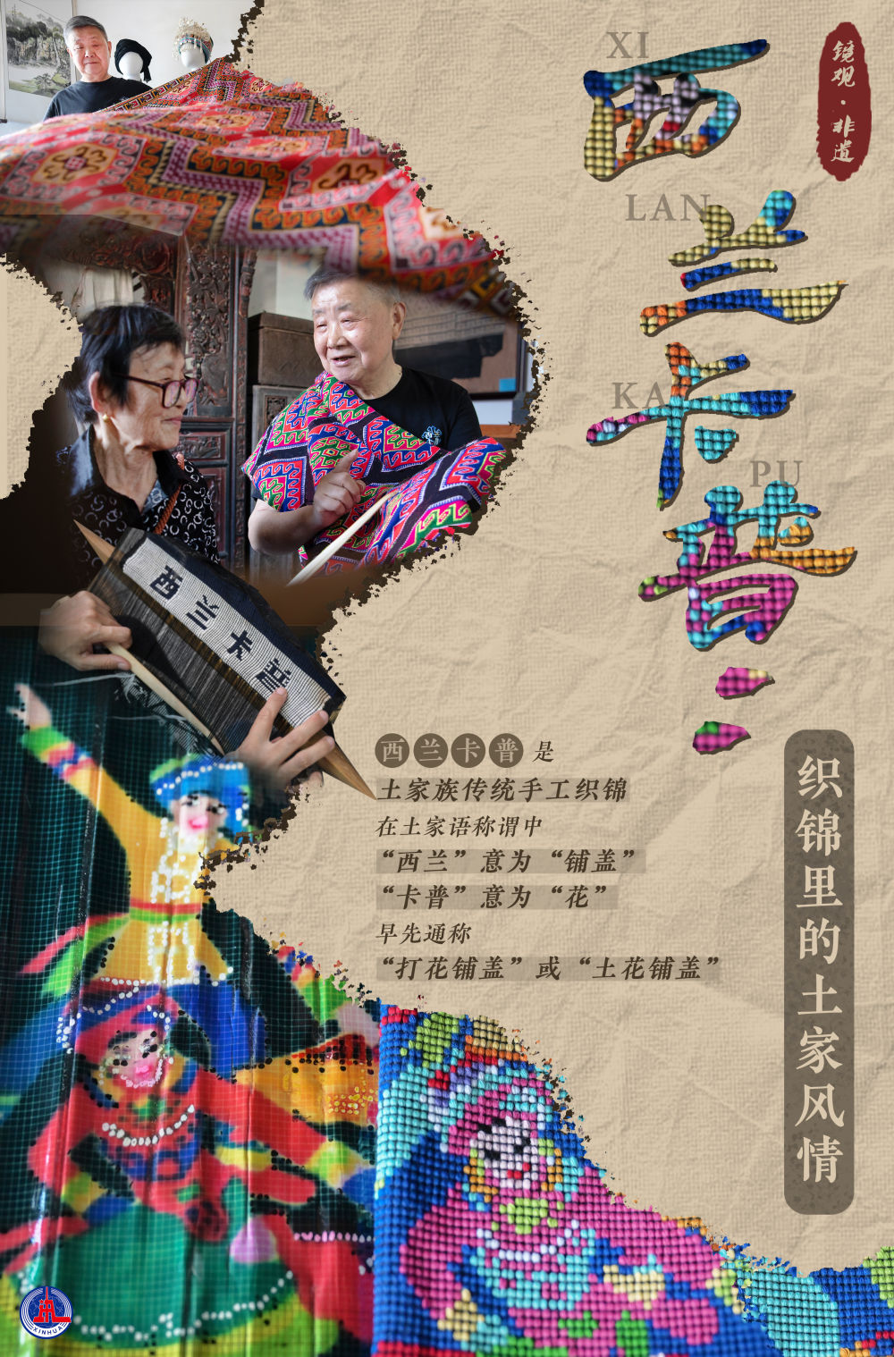 西蘭卡普是土家族傳統(tǒng)手工織錦,在土家語稱謂中,“西蘭”意為鋪蓋,“卡普”意為花,早先通稱“打花鋪蓋”或“土花鋪蓋”。土家孩子出生時外婆要送織錦,嬰幼兒時要蓋織錦,女孩子自小學習織錦,出嫁時在織機上制作西蘭卡普作為陪嫁。西蘭卡普記錄了土家族的風俗和情感,與土家人的生活息息相關(guān),被譽為土家族的“五彩活化石”,2006年被列入國家級非物質(zhì)文化遺產(chǎn)名錄。
