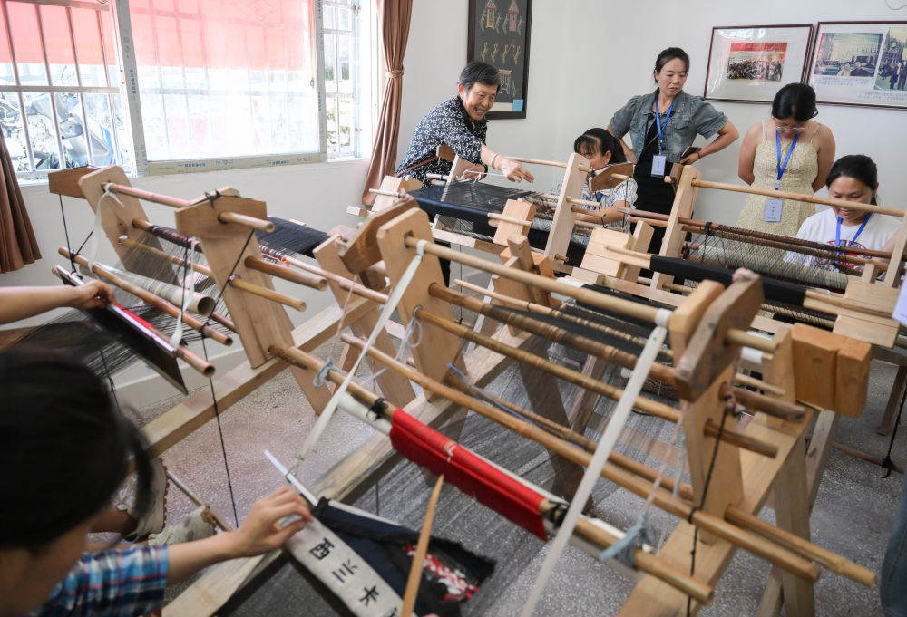 7月2日,唐洪祥的老伴劉秀琴(后左一)指導前來學藝的學員們操作織機。