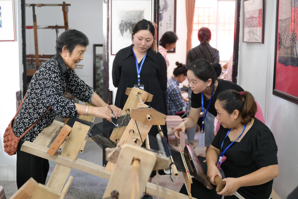 7月2日,湖北省來鳳縣桂花樹社區(qū),唐洪祥的老伴劉秀琴(左一)指導前來學藝的學員們操作織機。