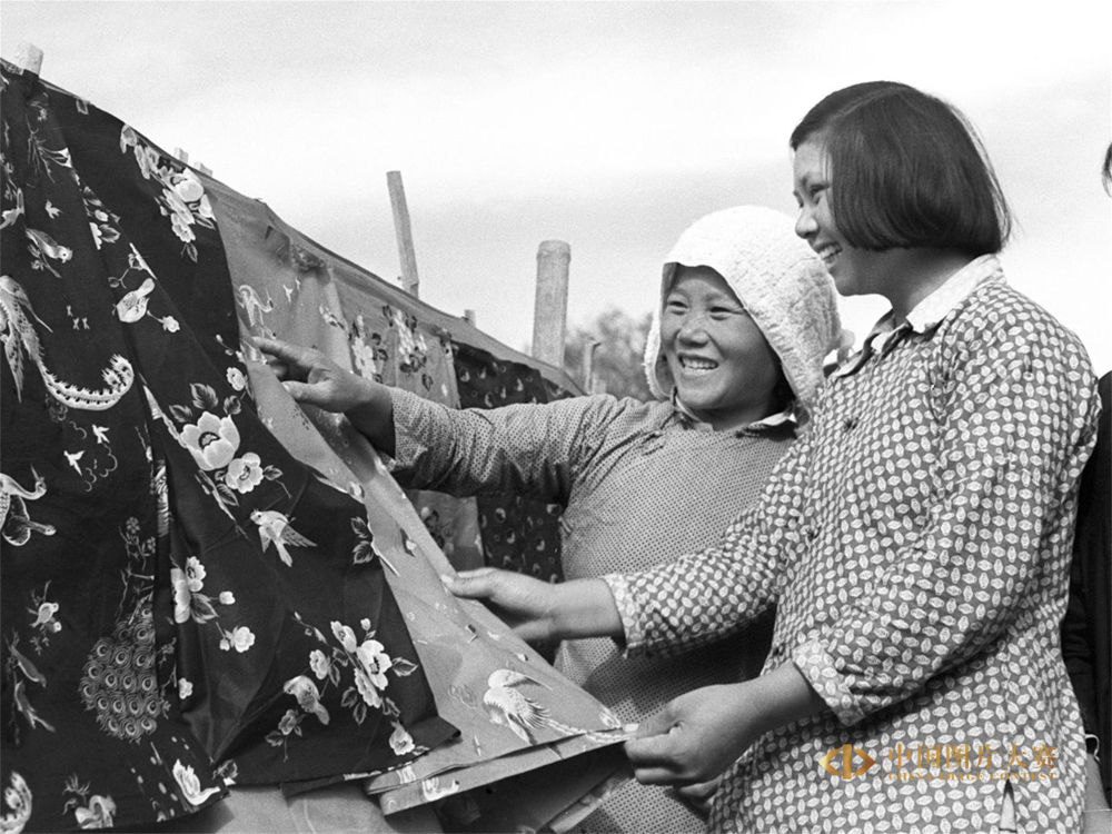 1955年10月13日,國營上海第五印染廠工人帶著印花色布,向上海市江灣區(qū)市京村、自由村兩個農(nóng)業(yè)生產(chǎn)合作社的農(nóng)民征求意見。王朝楨 攝/新華社中國照片檔案館