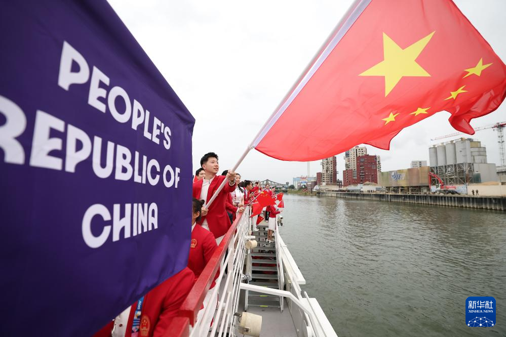 7月26日,中國(guó)體育代表團(tuán)旗手、花樣游泳選手馮雨在開幕式上揮舞國(guó)旗。新華社記者 曹燦 攝