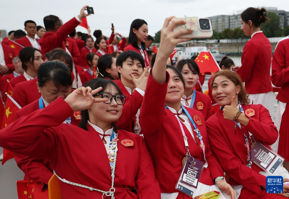 7月26日,中國(guó)體育代表團(tuán)成員在開幕式前自拍留影。新華社記者 曹燦 攝