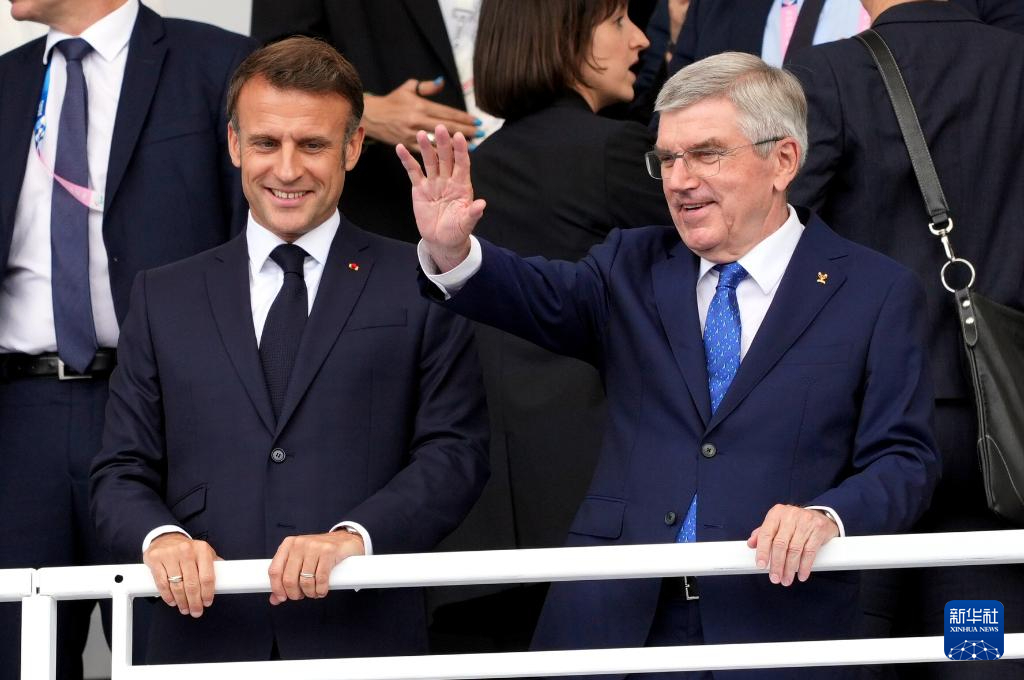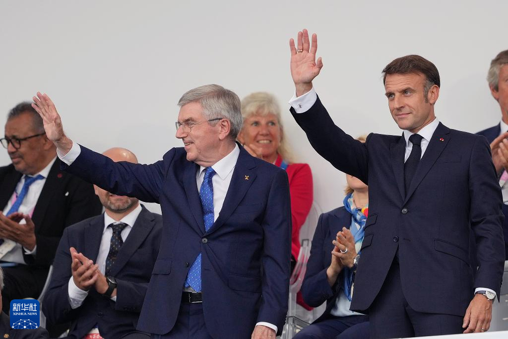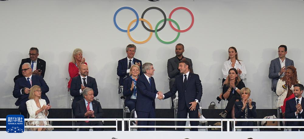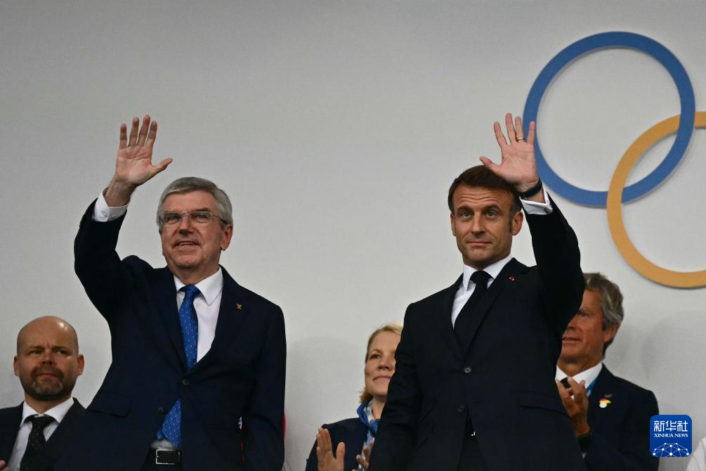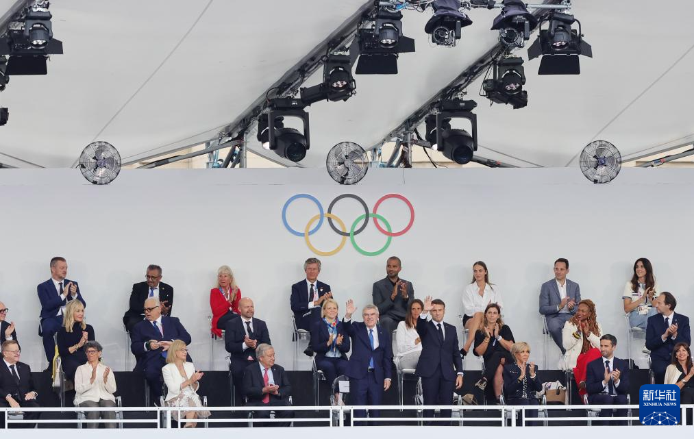 7月26日,國(guó)際奧委會(huì)主席巴赫(上左)和法國(guó)總統(tǒng)馬克龍出席開幕式。新華社記者 高靜 攝