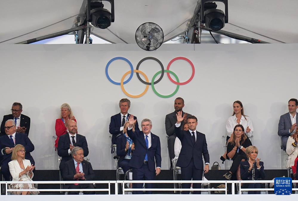 7月26日,國(guó)際奧委會(huì)主席巴赫(前排左三)和法國(guó)總統(tǒng)馬克龍(前排右三)出席開幕式。新華社記者 許暢 攝pagebreak