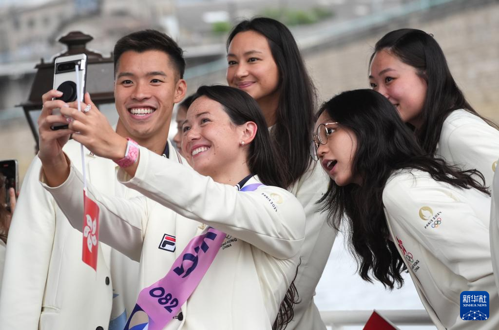 7月26日,中國(guó)香港體育代表團(tuán)成員在開幕式上自拍。新華社記者 呂小煒 攝pagebreak