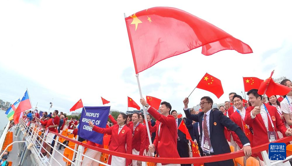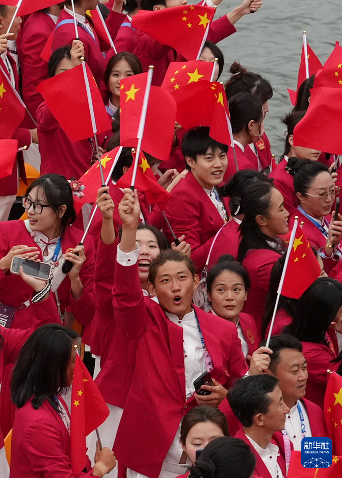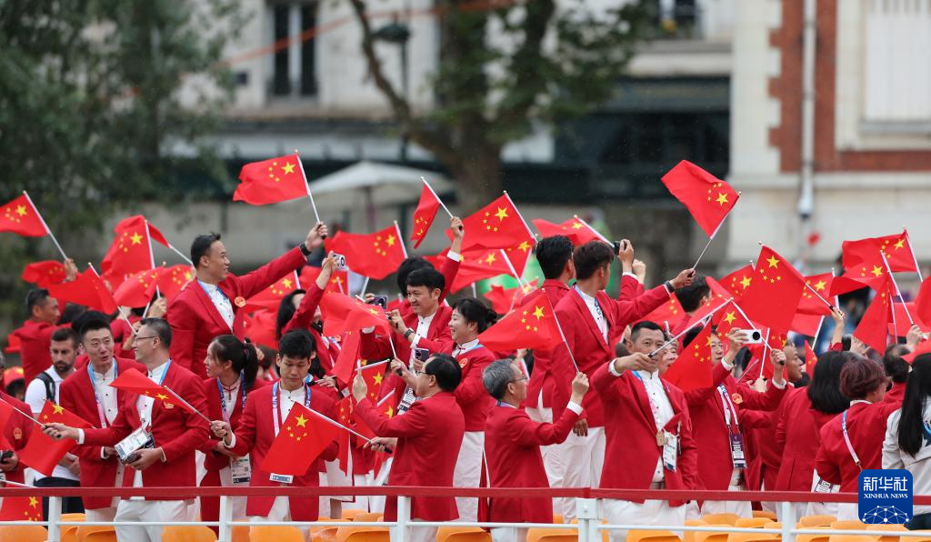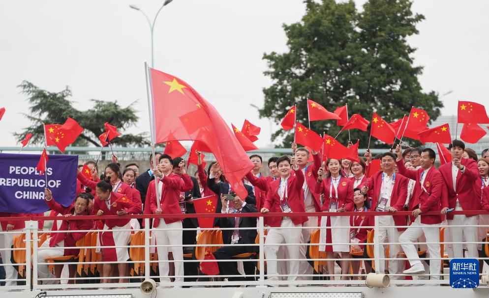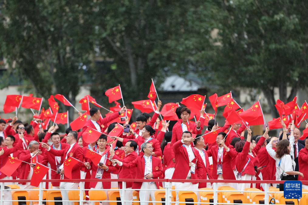 7月26日,中國(guó)體育代表團(tuán)成員在開幕式現(xiàn)場(chǎng)。新華社記者 王毓國(guó) 攝