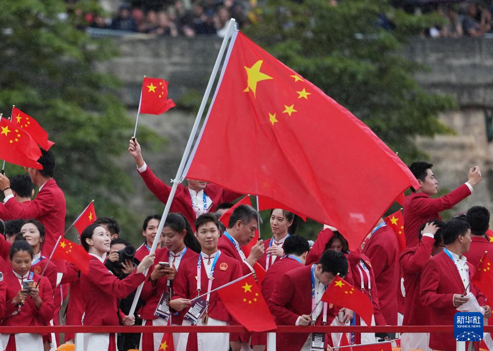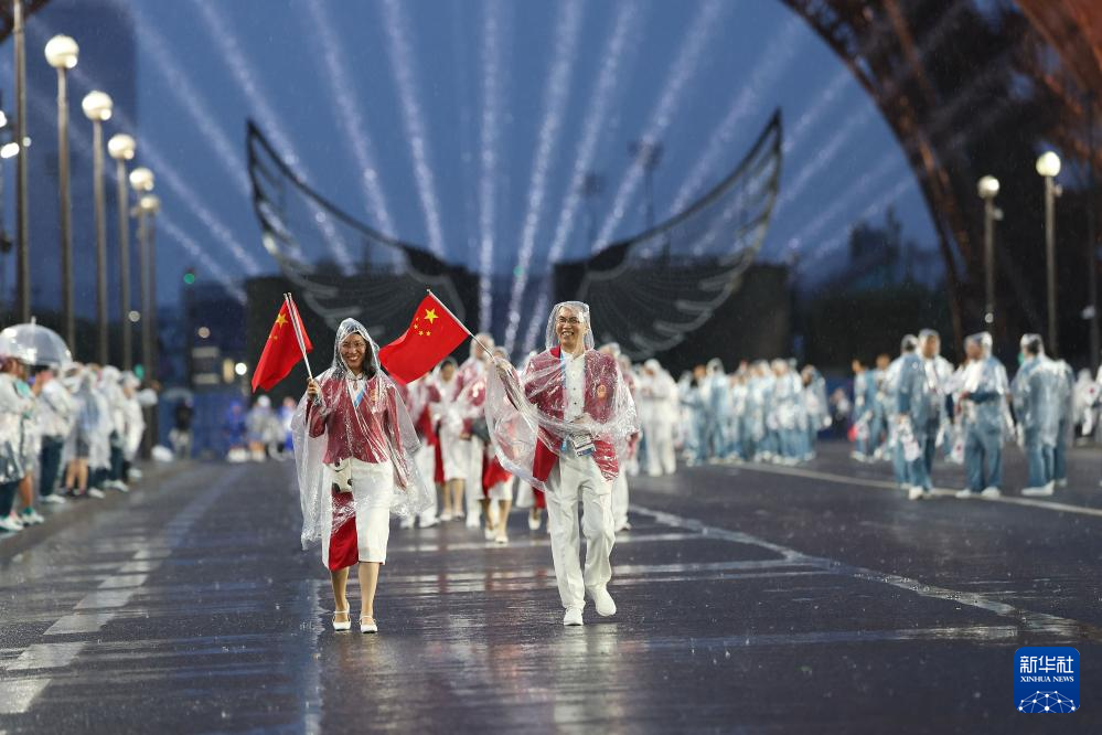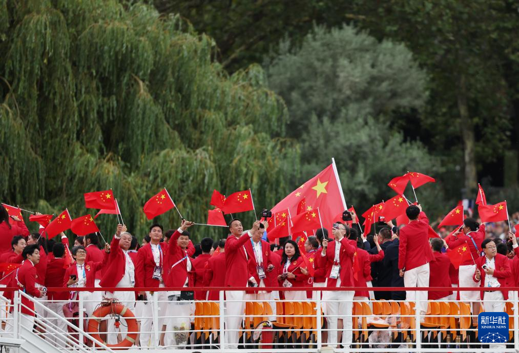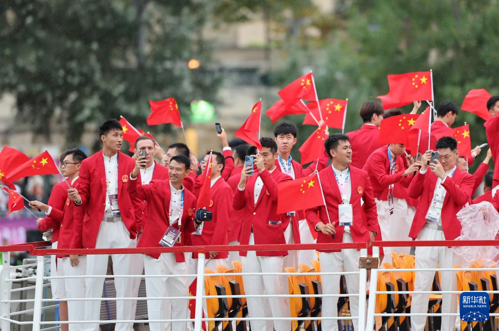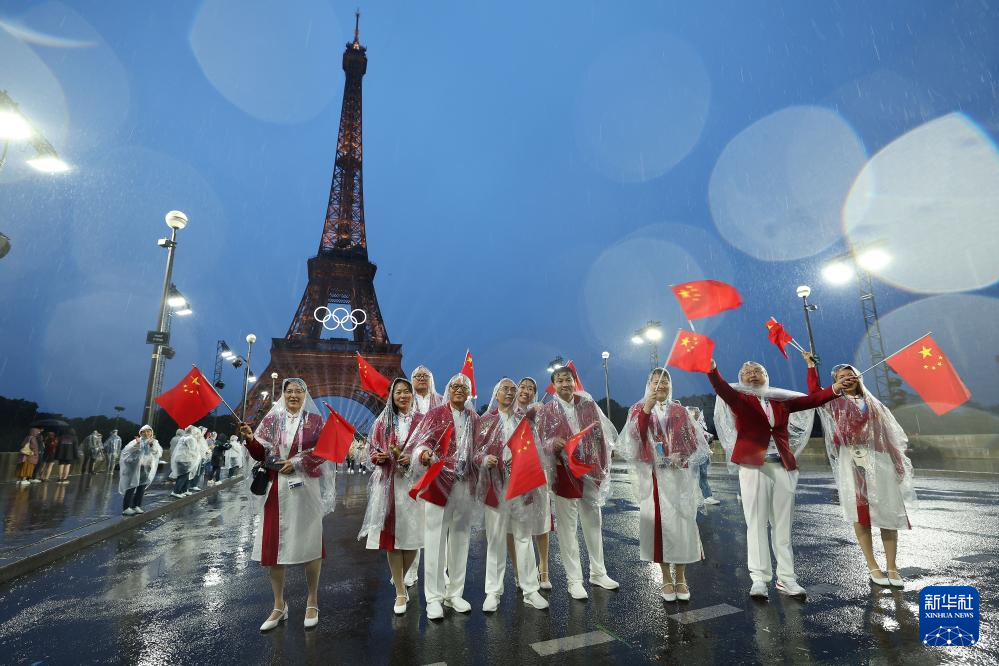 7月26日,中國(guó)體育代表團(tuán)成員在開幕式現(xiàn)場(chǎng)。新華社記者 王毓國(guó) 攝