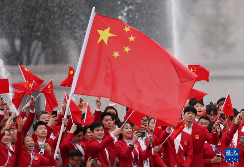 7月26日,中國(guó)體育代表團(tuán)在開幕式上。新華社記者 郭昱 攝