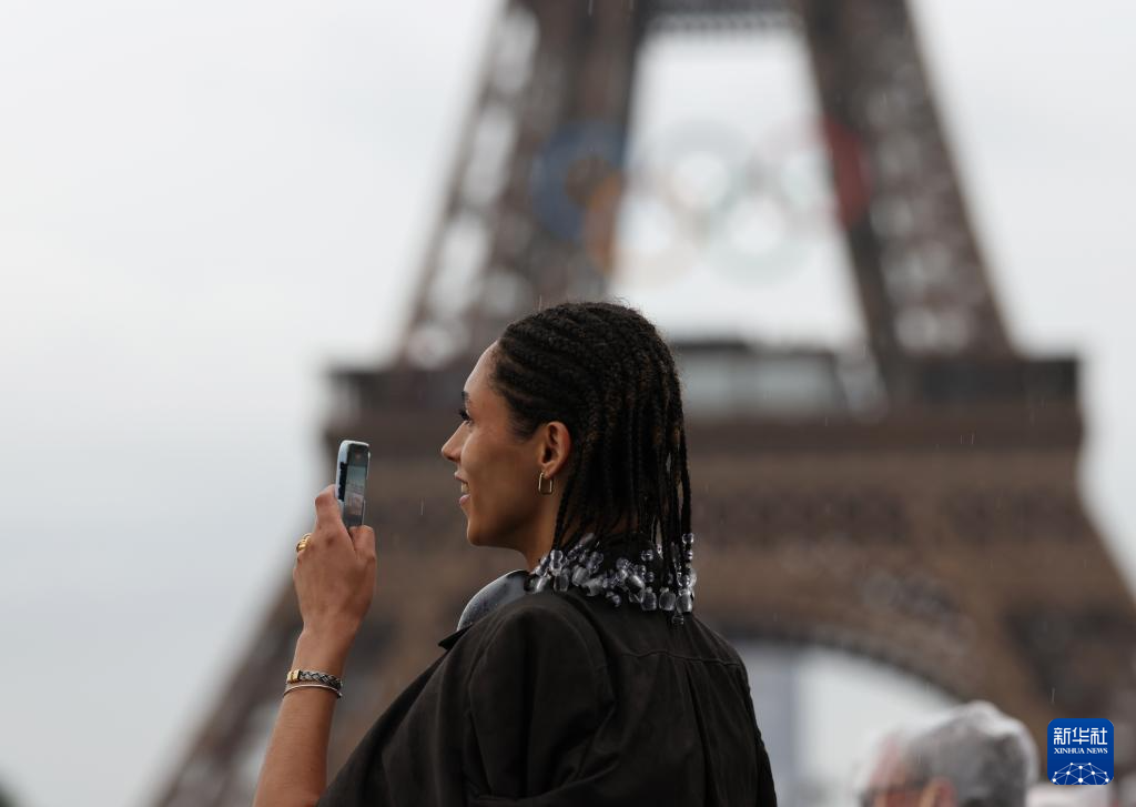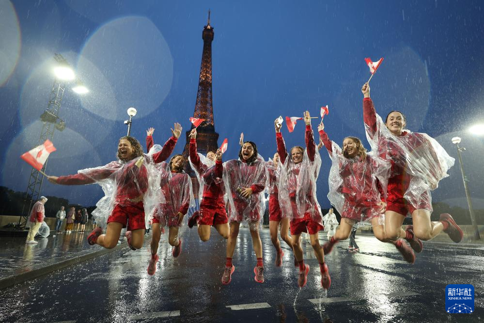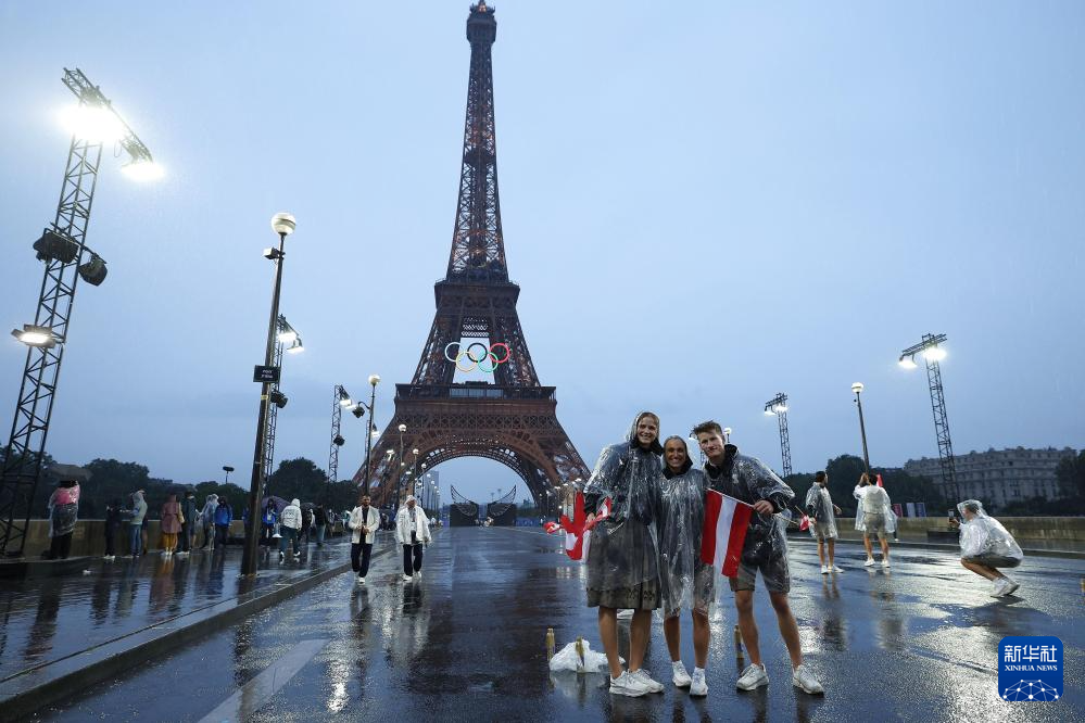 7月26日,加拿大體育代表團(tuán)成員在埃菲爾鐵塔前。新華社記者 李明 攝