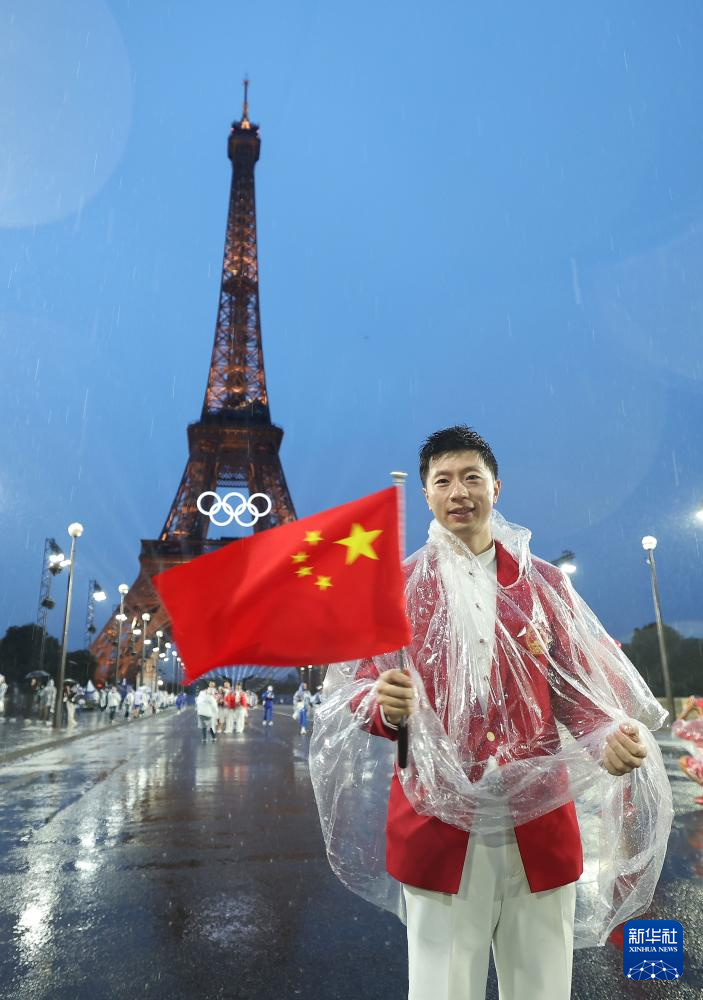 7月26日,中國(guó)體育代表團(tuán)旗手、乒乓球選手馬龍?jiān)陂_幕式前揮舞國(guó)旗。新華社記者 曹燦 攝