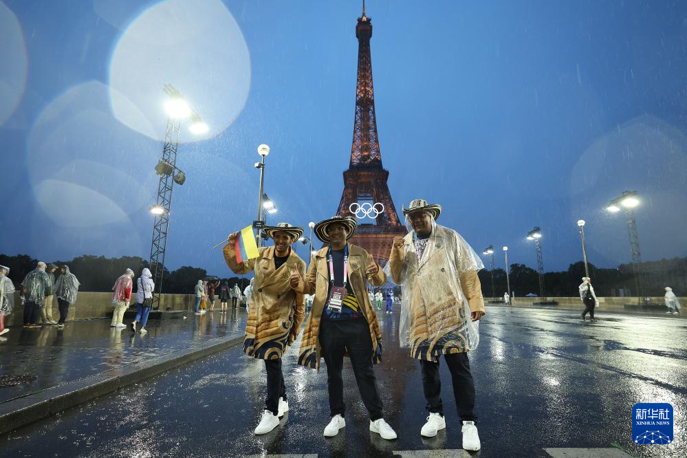7月26日,哥倫比亞體育代表團(tuán)成員在埃菲爾鐵塔前。新華社記者 李明 攝