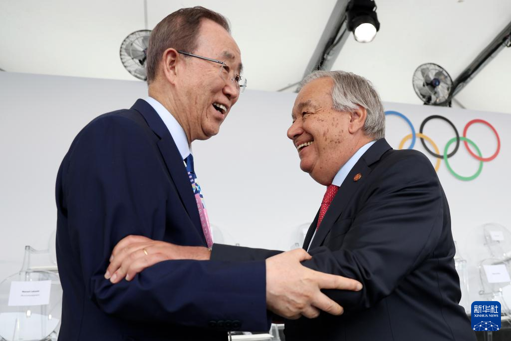 7月26日,聯(lián)合國(guó)秘書長(zhǎng)古特雷斯(右)與聯(lián)合國(guó)前秘書長(zhǎng)潘基文在開幕式前致意。新華社發(fā)(POOL照片/帕斯卡爾·勒·塞格雷坦)