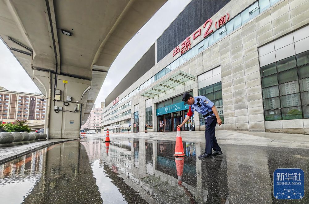 7月28日,在沈陽北站,沈陽鐵路公安處民警在出站口附近的積水處設(shè)立警示標(biāo)志。 新華社發(fā)