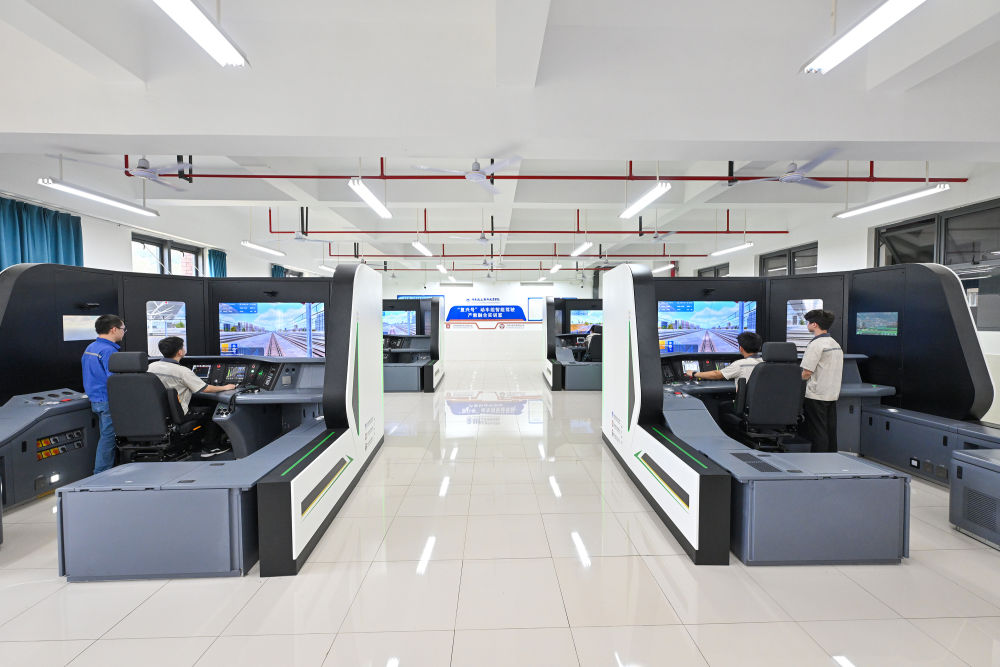 7月26日,湖南鐵道職業(yè)技術(shù)學(xué)院的學(xué)生在產(chǎn)教融合“復(fù)興號”動(dòng)車組智能駕駛實(shí)訓(xùn)室內(nèi)學(xué)習(xí)動(dòng)車駕駛。 新華社記者 李鑫 攝