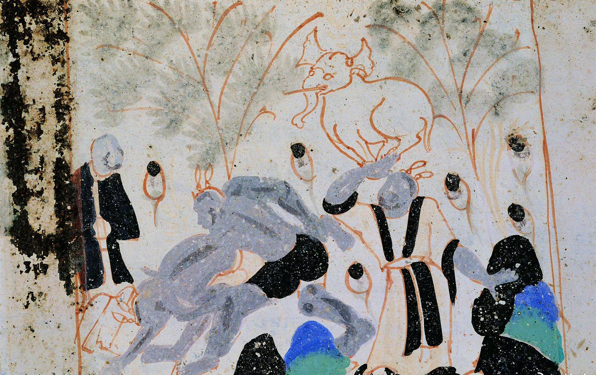 摔跤:古代運動中,摔跤就一直是主要的比賽項目之一。莫高窟第290窟中就描繪了一場緊張的摔跤比賽,畫面上,兩名頭扎丱角髻,下穿兜襠的對手正在一決勝負(fù),旁邊還繪有裁判。這幅千年前的畫面將摔跤、相撲比賽中講求技巧和戰(zhàn)術(shù)形象地表現(xiàn)了出來。莫高窟第290窟,北周。