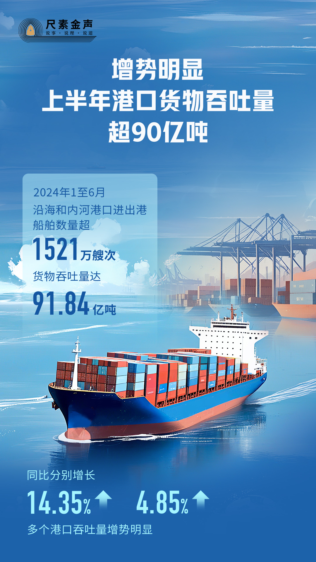 港口,貨物進(jìn)出口的重要門戶;港口貨物吞吐量,國(guó)民經(jīng)濟(jì)發(fā)展的“晴雨表”。日前,中國(guó)港口運(yùn)行“半年報(bào)”公布:今年1至6月,沿海和內(nèi)河港口進(jìn)出港船舶數(shù)量超1521萬艘次,貨物吞吐量達(dá)91.84億噸,同比分別增長(zhǎng)14.35%、4.85%,多個(gè)港口吞吐量增勢(shì)明顯。