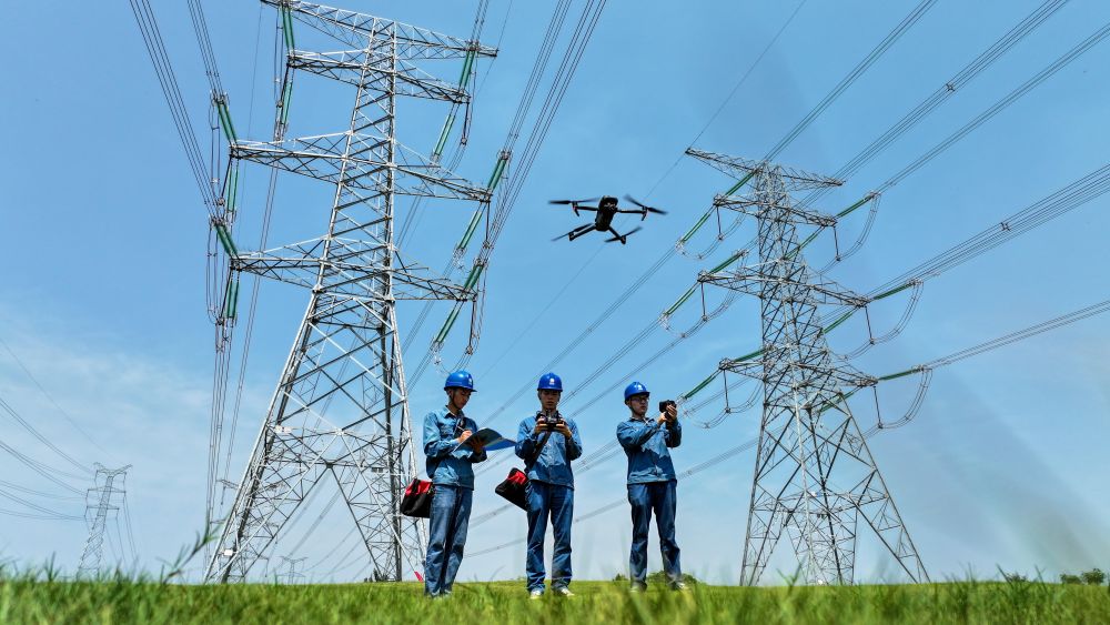 面對安徽、江蘇持續(xù)高溫,皖蘇兩省的電力工人聯(lián)合對省際聯(lián)絡(luò)線及相關(guān)配電設(shè)施進(jìn)行檢修,并開展輸變電設(shè)施巡視檢查。這是在安徽省滁州市南譙區(qū),電力工人運(yùn)用無人機(jī)對500千伏輸電線路進(jìn)行巡視檢查(2024年8月9日攝)。新華社記者 曹力 攝