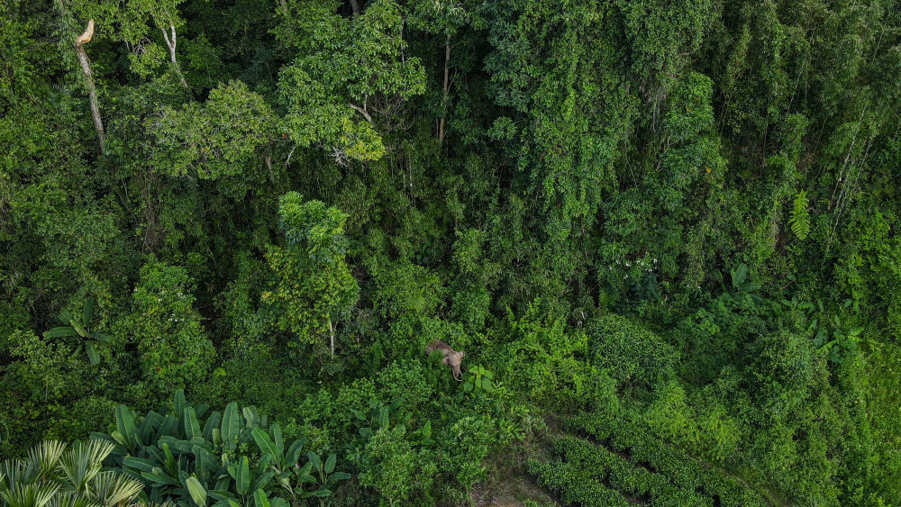 在云南西雙版納國家級自然保護(hù)區(qū)勐養(yǎng)片區(qū)邊緣活動的亞洲象阿寶(7月26日無人機照片)。(許團(tuán)明 攝)
