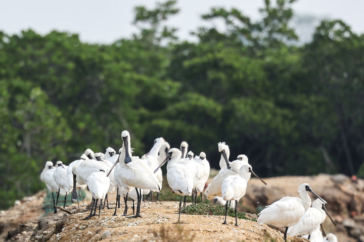 一群黑臉琵鷺在海南新盈紅樹(shù)林國(guó)家濕地公園休憩(2023年12月27日攝)。