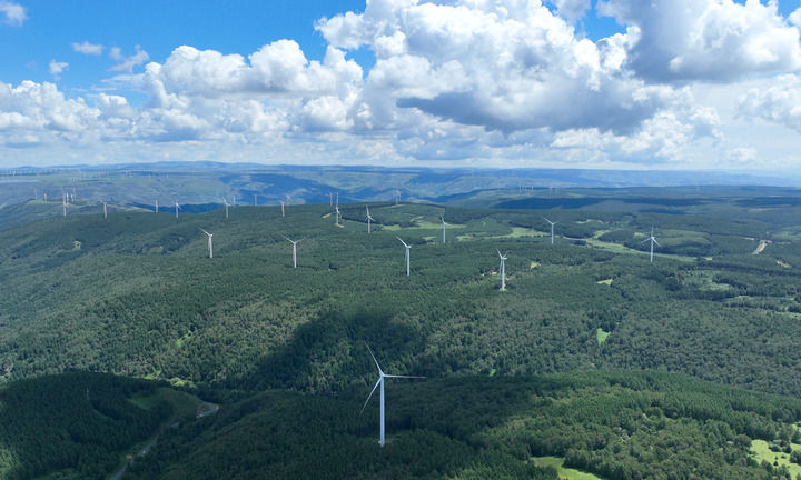 這是河北省圍場(chǎng)滿(mǎn)族蒙古族自治縣御道口鎮(zhèn)附近的風(fēng)電場(chǎng)(2024年7月26日攝,無(wú)人機(jī)照片)。