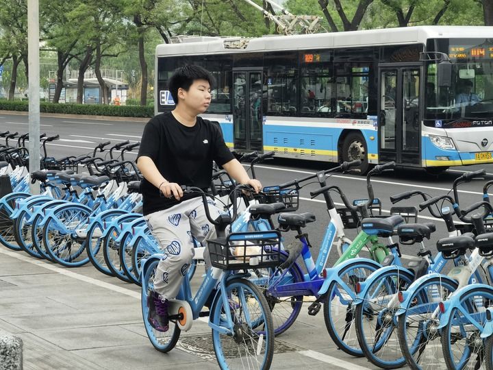 北京街頭,一名年輕人使用共享單車(chē)出行(2024年4月22日攝)。