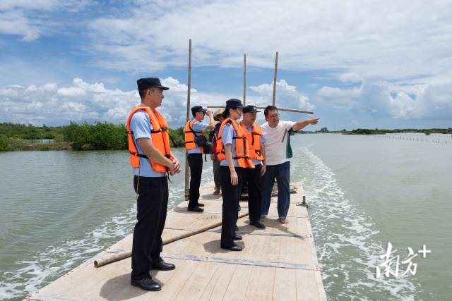 正是開(kāi)工的好時(shí)候。4人熟練地登上舢板,沿著海岸線(xiàn)劃行,駛往保護(hù)區(qū)深處一個(gè)養(yǎng)殖塘。他們不時(shí)站到船頭,仔細(xì)打量岸邊的紅樹(shù)林,不斷向魚(yú)塘主老黃問(wèn)話(huà)。