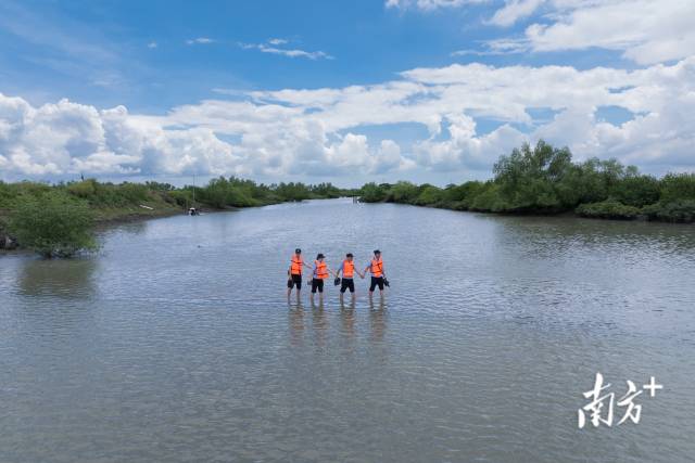 民警涉水前往麻章區(qū)湖光鎮(zhèn)料村一海邊養(yǎng)殖塘,查看紅樹(shù)林復(fù)種情況。