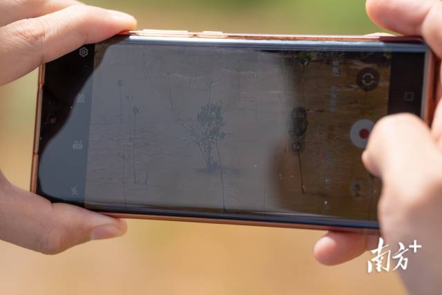 李明霖用手機(jī)拍下剛復(fù)種不久的“樹(shù)寶寶”。通過(guò)不同時(shí)間的影像對(duì)比,他們可以監(jiān)測(cè)紅樹(shù)林總體長(zhǎng)勢(shì)。