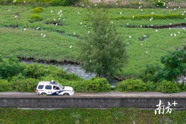 派出所的警車(chē)駛過(guò)一片紅樹(shù)林,成群的鷺鳥(niǎo)跟著警車(chē)在空中飛翔。