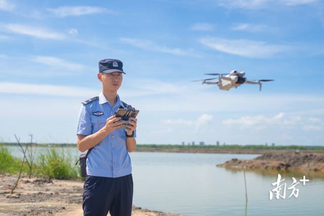 李明霖用無(wú)人機(jī)航拍紅樹(shù)林,觀察記錄保護(hù)情況。