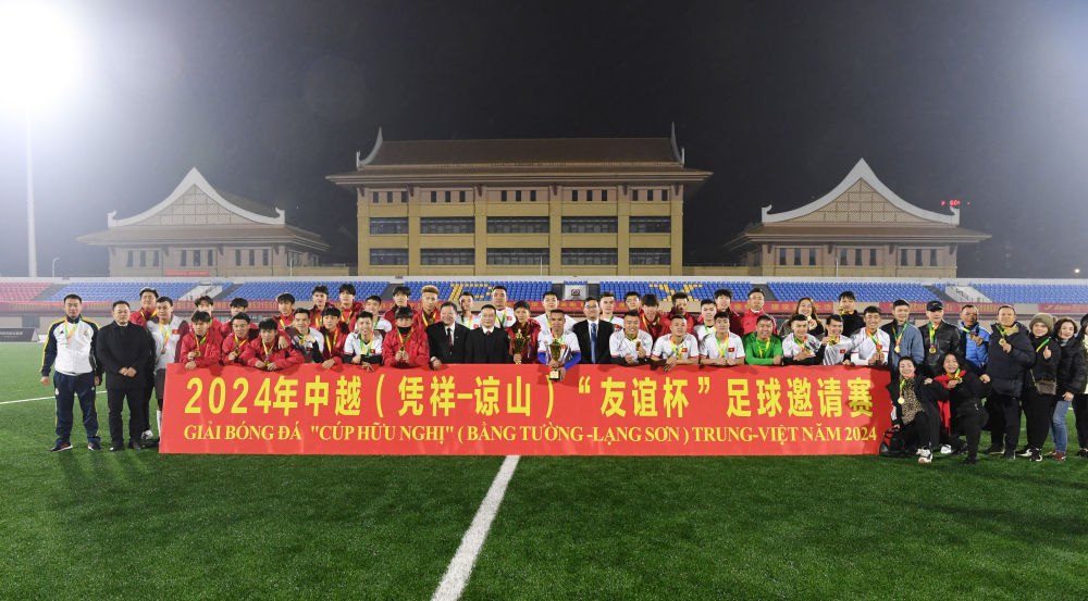 2024年中越(憑祥-諒山)“友誼杯”足球邀請賽,賽后雙方隊員合影。(龐立堅 攝)