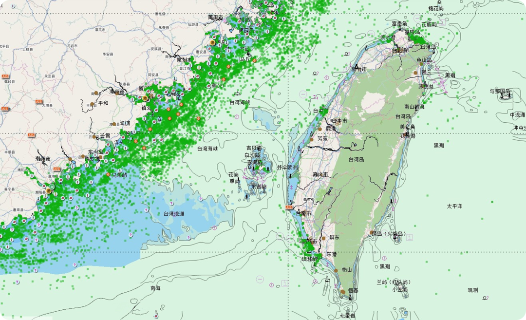 ?。_灣海峽航行船舶實(shí)時(shí)分布情況(綠點(diǎn)代表正在臺灣海峽航行的船只)